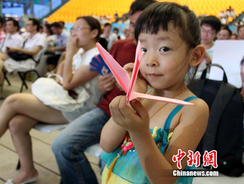 而經典紅歌音樂會現(xiàn)場的近千名世博游客也紛紛親手折制紙鶴,將其一一放到舞臺上為舟曲人民祈福,整場音樂會充滿溫馨與感動。