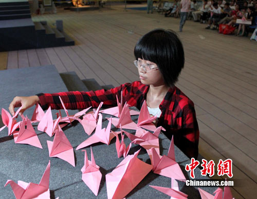 14日晚,在中國元素活動區(qū)里舉行的“中國元素民歌賞析會暨高暢經典紅歌音樂會”上,主唱高暢和前來觀看演出的千名游客同折千只紙鶴為舟曲祈福。