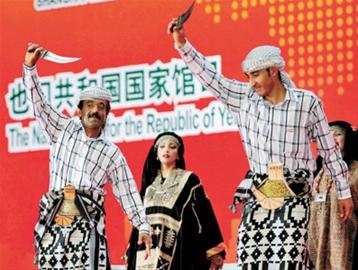 也門(mén)位于阿拉伯半島西南端。也門(mén)館館內(nèi)設(shè)計(jì)仿照薩那老城 “銅器市場(chǎng)”的樣貌,并在背景上采用薩那老城古老塔樓的照片。(張駿)