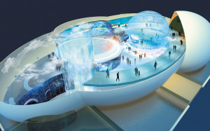 展館內(nèi)部以“云中漫步”概念為主線,進(jìn)入世界氣象館,參觀者仿佛搭乘“穿云飛船”置身于云層中,一路漫步“氣候變化云廊”,領(lǐng)略“云頂觀象”奇觀,觀測“小球大世界”實(shí)時變化、體驗(yàn)“世博氣象臺”科技實(shí)力,展望“未來之家”的優(yōu)質(zhì)氣象服務(wù)。