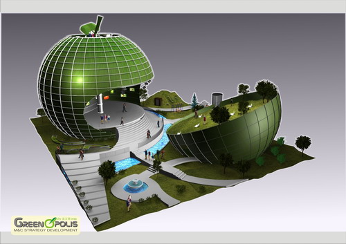 羅馬尼亞國家館的蘋果外形和標志文字“GREENOPOLIS”體現(xiàn)了健康生活方式的重要性、對可持續(xù)發(fā)展理念的關注以及針對現(xiàn)代社會普遍存在問題的以知識為本的解決方案。