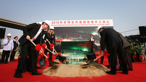 5月15日下午,上海世博會(huì)丹麥國(guó)家館在世博園區(qū)開(kāi)工建設(shè),丹麥館以“夢(mèng)想城市”命名,將邀請(qǐng)各國(guó)參觀者步入丹麥?zhǔn)降耐捠澜,體驗(yàn)丹麥的城市生活。上海世博會(huì)事務(wù)協(xié)調(diào)局局長(zhǎng)特別助理張?zhí)N杰、丹麥王國(guó)駐上?傤I(lǐng)事何麗蘭(Susanne Hyldelund)和丹麥館項(xiàng)目總監(jiān)韓少江(John Hansen)等出席動(dòng)工儀式。