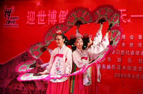 6月27日下午,上海市浦東新區(qū)花木社區(qū)文化活動(dòng)中心熱鬧非凡,熱烈的掌聲和歡快的音樂聲不時(shí)地響起,由上海世博局和2012年韓國麗水世博會(huì)組委會(huì)聯(lián)合主辦、上海市學(xué)習(xí)型社會(huì)建設(shè)服務(wù)指導(dǎo)中心和浦東新區(qū)社區(qū)學(xué)院協(xié)辦的“迎世博倒計(jì)時(shí)300天——中韓民眾社區(qū)大聯(lián)歡”活動(dòng)正在這里舉行。麗水世博會(huì)組委會(huì)秘書長金丙一、韓國駐滬副總領(lǐng)事延上模、上海世博局副局長朱詠雷、上海市學(xué)習(xí)型社會(huì)建設(shè)服務(wù)指導(dǎo)中心副主任王連華等出席活動(dòng)。