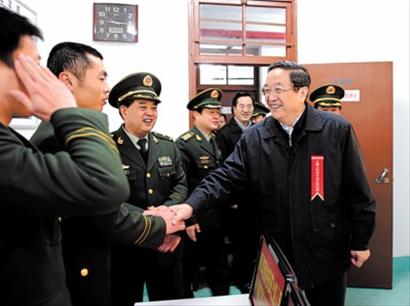 俞正聲和丁薛祥、陳豪、胡延照、王新奎、張學(xué)兵等來到武警上海市總隊(duì)世博安保任務(wù)部隊(duì)某部,實(shí)地察看值班室,聽取園區(qū)安保情況介紹;走進(jìn)部隊(duì)營房,與武警戰(zhàn)士親切交談,了解戰(zhàn)士們的訓(xùn)練、生活情況。聽到戰(zhàn)士們對生活保障表示滿意,俞正聲十分高興,他說:“春節(jié)即將來臨,請向你們的家人問好。今年迎辦世博的任務(wù)很繁重,相信通過大家的共同努力,我們一定能實(shí)現(xiàn)平安世博的目標(biāo)!睉(zhàn)士們鏗鏘作答:“為世博爭光彩,為祖國作奉獻(xiàn),永遠(yuǎn)做黨和人民的忠誠衛(wèi)士!