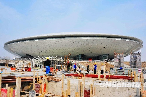 3月10日,距離2010年上海世博會(huì)開幕還有52天,世博園區(qū)工程已經(jīng)完成了95%以上,一軸四館中開工最晚的世博文化中心,其內(nèi)部已進(jìn)入最后的裝修收尾階段。配套的水、機(jī)電等系統(tǒng)開始進(jìn)行調(diào)試,外部的草坪鋪設(shè)和道路修整也進(jìn)入沖刺階段,預(yù)計(jì)所有工作將確保在本月底完成。中新社發(fā) 沈春琛 攝
