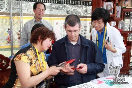 除制瓷以外,參觀寶鋼大舞臺的外國游客還常常熱衷于剪紙、織錦、皮影、旗袍等中國傳統(tǒng)文化,常常盯著一件作品看上老半天,如果碰巧遇上創(chuàng)作演示,更是不看到成品不罷休。每逢這時,獻(xiàn)藝的各位工藝大師總是會熱情地邀請他們親自試一試,剪下一朵花,或畫下一尾魚,體驗(yàn)中國文化的奇妙。大師們頗有心得地說,語言不是障礙,微笑就是最好的溝通。