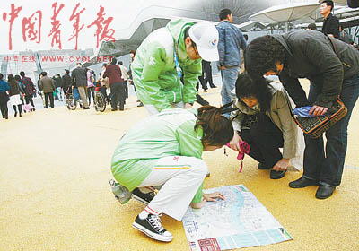 中國館南廣場上的30名首批志愿者都是來自復(fù)旦大學(xué)的學(xué)生。他們的工作在很多人看來很簡單,就是疏導(dǎo)游客,給游客指路。他們每天要重復(fù)幾萬次的回答就是:“對不起,預(yù)約券已經(jīng)發(fā)完了”,“您好,請往這邊走”……“現(xiàn)在我已經(jīng)不用看地圖就能清楚地給游客指路了。以前還不熟悉的時(shí)候,我利用休息的時(shí)間不斷地看地圖,已經(jīng)翻爛了兩份地圖,這是第三份了!卞X琲從包里翻開她的園區(qū)地圖,這一份也已經(jīng)快被她翻爛了,快斷裂的地方她用透明膠布粘著。