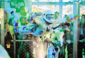在展館樓上,有一個8米高的“玻璃房子”,一鼓風(fēng),玻璃房內(nèi)的人可以飛起來,風(fēng)洞的風(fēng)速可以在瞬間達(dá)到20公里/小時,穩(wěn)穩(wěn)托舉住“飛人”。在昨天開館儀式后,拉脫維亞總理東布羅夫斯基斯身穿“飛翔服”,戴上頭盔,親身體驗了一回當(dāng)空中飛人的感覺,將現(xiàn)場氣氛推向高潮。