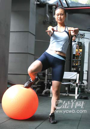 坐在健身球上,腹部穩(wěn)定,上身不晃,一條腿自然坐姿,另一條腿抬起與上身呈90度,繃起腳尖,保持1分鐘。兩腿交替,各做20次。