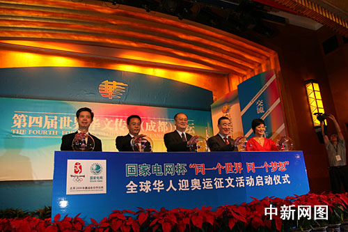 在第四屆世界華文傳媒論壇成功舉辦之際,中國國家電網公司和中國新聞社共同主辦的“國家電網杯‘同一個世界同一個夢想’――全球華人迎奧運征文”活動今天正式啟動。作為此次活動的支持單位,我代表國務院僑務辦公室對這一意義重大的活動表示熱烈的祝賀,預祝并相信活動將取得圓滿成功。