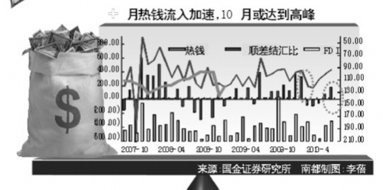 對熱錢推動的流動性充沛可以持續(xù)多久的問題,國金證券分析認為,“全球流動性充沛正成為中期問題。地產(chǎn)調(diào)控、升值預期的明確以及美元趨勢、熱錢的監(jiān)管加強使得熱錢流入速度在10月達到高峰后趨于緩和。”國內(nèi)的熱錢流入成為短期內(nèi)無法拒之門外的中期問題。預計11月份熱錢流入的增長速度將轉(zhuǎn)緩,但是流動性數(shù)量的轉(zhuǎn)折至少要到2011年2季度才能看到。
