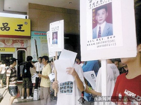 由于自己投資了1000萬元跟南寧市某房地產(chǎn)公司合作開發(fā)一個小區(qū),但該公司的法人鄭某竟將上億資金卷走,當(dāng)事人經(jīng)過幾年的尋找卻找不到鄭某。昨日,柳州市國泰房產(chǎn)開發(fā)有限責(zé)任公司法人陳健美采取“非常手段”,帶著公司員工和親戚來到南寧市火車站、朝陽廣場、萬達(dá)廣場等繁華地帶,舉著鄭某的照片,懸賞1萬元,“尋找南寧最大的老賴”,此舉吸引了不少市民的眼球。