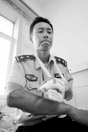 王梓的左手已經(jīng)被包扎上,紗布上面滲出很多鮮血。王梓的上肢到處都有很嚴(yán)重的擦皮傷,警褲多處已經(jīng)撕裂。