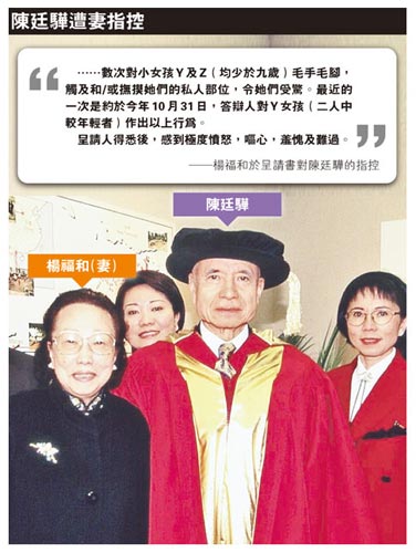 在楊福和控告次女之前,原來早于去年12月9日已向家事法庭提出離婚呈請。楊福和當(dāng)時向法庭提出,丈夫于2004至2005年期間,曾經(jīng)作出不合理行為(unreasonable behaviour),二人不能再共同生活。到今年10月2日,楊福和向法庭呈交補充資料,指陳廷驊曾經(jīng)對身邊傭人及護士作出不當(dāng)行為,令她憶起丈夫過去曾經(jīng)不忠,楊福和更透過律師稱,陳廷驊曾摸兩名年僅8歲及5歲的曾孫女,楊感到羞恥,稱不能接受有關(guān)行為。