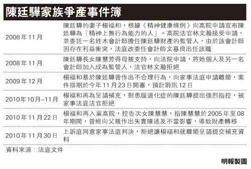 陳廷驊的86歲妻子楊福和,上周入稟高院控告次女、已于2009年接替父親出任南豐集團董事總經(jīng)理的陳慧慧,指后者于2003年至2005年期間,曾對父親作出虛假陳述及不當(dāng)影響,造成財產(chǎn)轉(zhuǎn)移。該案除了牽涉母女二人,據(jù)悉陳廷驊的大女兒陳慧芳也有重要角色,案件的觸發(fā)點其實是姐妹不和所致,而楊福和一直支持大女兒。另外,原來陳廷驊早于1995年已患腦退化癥。