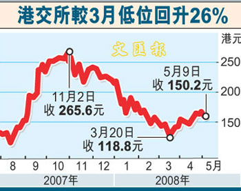 中新網(wǎng)5月13日電 據(jù)香港文匯報報道,市場分析預(yù)計,周三將公布首季業(yè)績的港交所,2008年首季凈利料將強(qiáng)勁增長,凈利料將同比增長56%至84%至14.4億元至17億元。