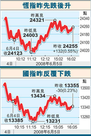 中新網(wǎng)6月6日電 據(jù)香港文匯報(bào)報(bào)道,美股回穩(wěn),港股兩日下跌過700點(diǎn)后,恒指5日全日收報(bào)24255.2點(diǎn),升132點(diǎn),但成交額減至638.8億元。證券業(yè)人士指,市場無特別利好消息,令大市缺乏方向,在外圍經(jīng)濟(jì)可能衰退的陰霾下,港股在現(xiàn)水位難有突破,現(xiàn)階段缺乏承接力,故相信會再下試24000點(diǎn)水平。