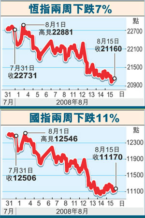 港股上周下跌725點,跌幅3.3%。大福資料研究高級經(jīng)理曹福達(dá)表示,港股正處于熊市二期,走勢相當(dāng)反復(fù),但相信在奧運后,股市有較顯著的反彈,而交投也將會再度活躍,令后市走勢明朗化。