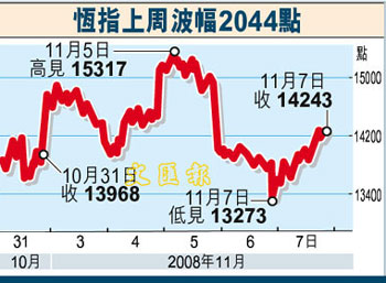葉尚志估計,港股在10676點見底后的第一波反彈,已在周三完成,當日恒指曾見過15318點,后市料進入反復(fù)整固階段,上下范圍在12500至15000點間,未來焦點則會放在將公布的內(nèi)地CPI和PPI數(shù)據(jù),以及本月15日舉行的G20首腦會議。