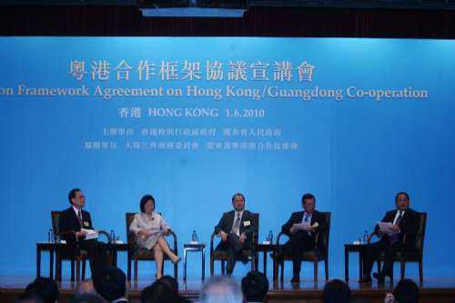 今年四月初,曾蔭權(quán)和黃華華等粵港政府高層,在習(xí)近平等中央領(lǐng)導(dǎo)人見證下,簽署《粵港合作框架協(xié)議》,揭開粵港緊密合作新篇章。昨日兩地政府再度連手,共同主辦宣講會(huì),意在向社會(huì)各界講解《框架協(xié)議》對(duì)兩地合作提出的六個(gè)明確定位和分工,以及兩地如何通過功能互補(bǔ)、協(xié)調(diào)發(fā)展,共同提升整個(gè)區(qū)域的綜合競爭力,以期讓各界更能掌握《框架協(xié)議》的機(jī)遇。