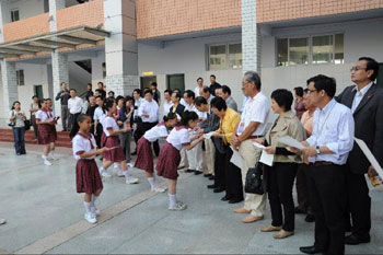 隨后,議員前往涪江路小學訪問,該校在完成重建后將成為一所完全小學。香港特區(qū)共提供超過1500萬元,以協(xié)助這所小學進行重建。在訪問期間,該校學生集體創(chuàng)作及繪畫了一幅圖畫送給議員,以表達對香港市民的謝意。曾鈺成在發(fā)言時表示,很高興看到同學們臉上的笑容,并鼓勵他們努力讀書。在離開前,曾鈺成以書法題詞,表達自己對學生的支持。