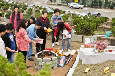 家族成員劉女士表示,祭品總值超過(guò)3000元,除部分洋酒、水果等食物會(huì)帶回家之外,其它諸如“金表”、“西服”等紙?jiān)榔范紩?huì)在拜祭后燒給先人使用。她表示,潮汕人對(duì)傳統(tǒng)祭祀習(xí)俗非常重視,一年一次的拜祭先人一定是召集全家族齊出動(dòng)。她又說(shuō):“年年祭祖,只有今年乳豬、燒雞、水果等祭品是雙份的,就連跪拜用的洋酒也帶了兩瓶。總之,大家的生活漸好,荷包也比往年漲一些,當(dāng)然也希望祖先吃好過(guò)好!奔抑凶钚〕蓡T趙同學(xué)說(shuō),自己專(zhuān)門(mén)準(zhǔn)備了黃菊花和百合獻(xiàn)給外公,“我今年是第一次來(lái)祭掃,還真沒(méi)見(jiàn)過(guò)這么隆重的祭祀場(chǎng)面!