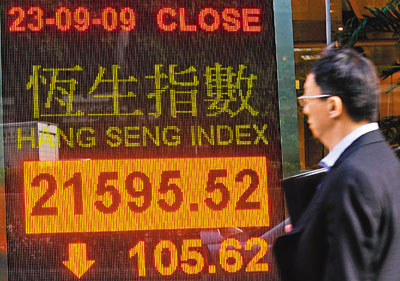 中新網9月24日電 據香港《文匯報》報道,美元匯價跌至13個月新低,不過亞洲股市回軟,內地A股、日股、臺股也受壓,港股23日跌105.6點,報21595.5點,成交額588.5億元。