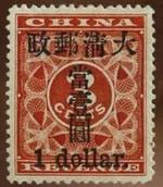這枚紅色印花郵票是清朝人用作繳交關(guān)稅的三分稅票,但國(guó)家郵政成立初期未有足夠郵票使用,在稅票蓋上一元,當(dāng)作郵票。