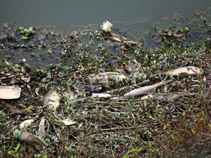 位于南粵批發(fā)市場(chǎng)后至青洲美樂(lè)花園之間的一段鴨涌河,可見(jiàn)有不少死魚(yú)尸體在水面漂浮,有些因河道水位下降,擱淺在近岸的泥沼草叢上,尸身已發(fā)脹且開(kāi)始腐爛及發(fā)出腥臭味,附近居民反映在晚間睡覺(jué)時(shí)不時(shí)聞到陣陣腥臭味。