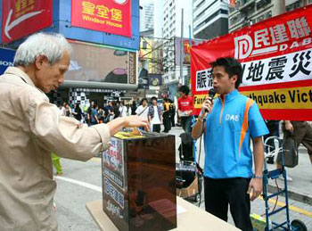 多個政黨、團體和商業(yè)機構均以不同方式參與賑災行動,包括街頭和商場義賣、獻唱、大球場義賽等,市民紛紛慷慨解囊,祈求為災民獻出一分力。