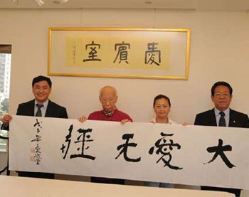 在這個(gè)“愛心書畫義賣區(qū)”內(nèi),最矚目的是國(guó)學(xué)大師饒宗頤教授親筆所寫的“大愛無疆”,這四個(gè)大字已被香港潮屬總會(huì)名譽(yù)會(huì)長(zhǎng)高佩璇居士以500萬(wàn)港元義購(gòu),可謂一字百萬(wàn)金。在這里,最珍貴的不是這些字,也不是這筆捐款,而在于它帶來的情感上的震撼,一種骨肉相連、發(fā)自肺腑的真情。