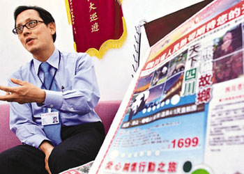 中旅社業(yè)務(wù)部副總經(jīng)理吳熹安表示,四川省旅游局宣布部分旅游景點(diǎn)恢復(fù)接待游客,故集團(tuán)實(shí)時推出低至7折、團(tuán)費(fèi)由1699元起的四川4天優(yōu)惠團(tuán),另推出團(tuán)費(fèi)2799元的5天愛心關(guān)懷團(tuán),行程除了傳統(tǒng)的樂山、峨眉山外,亦安排團(tuán)員參觀地震災(zāi)區(qū)民眾暫住的“溫馨家園”,讓團(tuán)員向四川人民送暖。