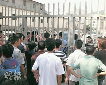 數(shù)百名供貨商20日上門追討貨款,被工人擋在門外。(圖片來源:明報(bào))