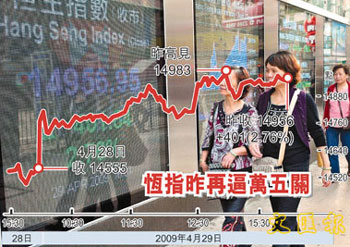 中新網(wǎng)4月30日電 據(jù)香港《文匯報》報道,市場憧憬國務(wù)院宣布將上海建設(shè)成國際金融中心及航運中心的細(xì)節(jié),A股29日午市急升近3%,刺激香港中資股升幅擴大,令港股在豬流感陰霾下連跌2天后終見反彈,于29日期指結(jié)算日被挾高,以接近全日高位收市,收報14956.9點升401.8點,總成交508億元。