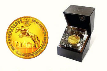 紀(jì)念章以925純銀鍍金鑄造,香港著名平面設(shè)計(jì)師陳幼堅(jiān),以馬術(shù)運(yùn)動員跨躍維港為主題,造工精細(xì),維港旁的建筑物清晰可辨;背面則以區(qū)徽及2008字樣作點(diǎn)綴。每枚紀(jì)念章均附有個(gè)別編號的鑒證書、水晶座及木盒,盒面用馬毛制成。