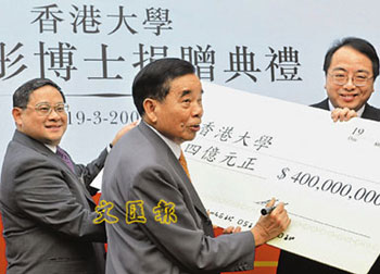 有關(guān)支票捐贈儀式19日于港大舉行,除鄭裕彤外,港大校務(wù)委員會主席馮國經(jīng)、校長徐立之、法律學(xué)院院長陳文敏等均有出席。馮國經(jīng)贊揚鄭裕彤一直對教育事業(yè)大力支持,這次捐贈也是對港大每一成員的鼓勵,他對此深表感激。徐立之則指,鄭裕彤的捐款除支持港大“百周年校園”計劃外,也有點名支持法律學(xué)院,對學(xué)院發(fā)展幫助甚大。
