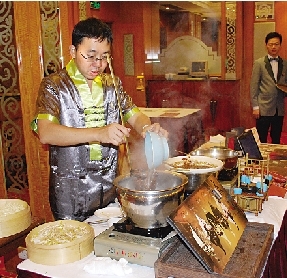 29日記者招待會(huì)現(xiàn)場(chǎng),更邀請(qǐng)六家本次參加美食節(jié)的臺(tái)灣與會(huì)美食餐廳,如青青餐廳、宜蘭礁溪老爺大酒店、南投金都餐廳、河邊海鮮餐廳、度小月?lián)忻妗⒅苁衔r卷即場(chǎng)示范鎮(zhèn)店之寶的烹調(diào),并向大家推介當(dāng)?shù)仫嬍澄幕?/p>