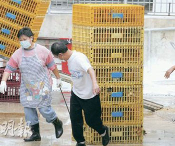 香港自元朗雞場爆發(fā)禽流感后禁售活雞21天,30日解禁,長沙灣批發(fā)市場工人29日趕忙將抵港內地活雞送往安置。(圖片來源:明報)