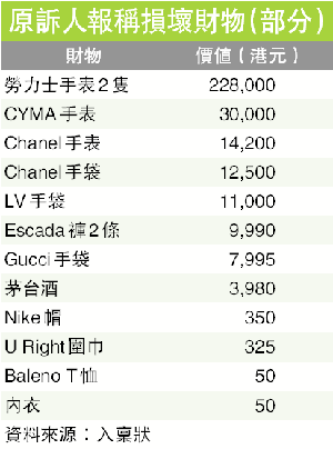 唐仔細(xì)羅列37項(xiàng)受損財(cái)物,其中以衣物為主,包括價(jià)值50元的內(nèi)衣及成衣品牌Baleno出品的T恤;另外的名貴財(cái)物包括接近4000元的茅臺酒、勞力士、Chanel及CYMA等4只名表,所有財(cái)品總值36.6萬元。此外,唐的一塊載有婚宴來賓簽字的紅布,以及數(shù)項(xiàng)衣物亦損壞,但價(jià)值有待確定。