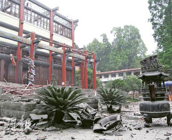 潘月荷遇事的地點都江堰青城山普照寺,在地震中損毀嚴(yán)重,石柱震碎,木制結(jié)構(gòu)被震至倒塌。(圖片來源:明報)