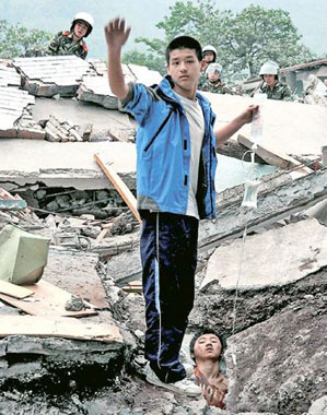 “你是我的好兄弟,我不想你死!”就是這一句生死誓約,北川中學(xué)高一(2)班的李陽(yáng)苦苦鼓勵(lì)他的同班同學(xué)廖波,并協(xié)助救援人員為廖波輸液,使廖波終于逃出生天。李陽(yáng)21日說(shuō),廖波的得救使他非常開心,很掛念這個(gè)同學(xué)。