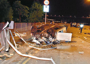 至21日凌晨零時27分,亡命飛車駛至深井青山公路,爬頭欲超越前面的士,但車頭撞上的士左尾部,全車失控鏟上路中安全島,反彈狂撞左邊行人路和路牌,全車反轉(zhuǎn)四輪朝天,車頂壓扁,前后擋風爆裂,四個車輪撞至彎曲,車內(nèi)兩人頭爆重傷被困。被撞的士則向前沖出30米,打轉(zhuǎn)掉頭才停下,車內(nèi)司機和兩名女乘客同告頭頸受傷被困。