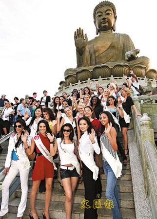 來自世界各地的國際小姐候選佳麗,30日暢游寶蓮寺,在天壇大佛前留影。(圖片來源:文匯報(bào))