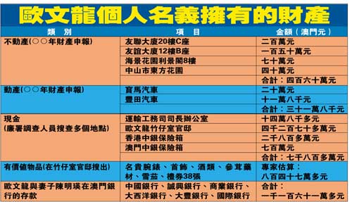 上述銀行保險箱鎖匙、單據(jù)、公司印章等物,大部分能在歐文龍官邸內(nèi)搜出。在歐記載于去年十月四日“友好手冊”的財產(chǎn)統(tǒng)計表,羅列款項達七億五千○一萬澳門元(未計不動產(chǎn)),這與廉署搜出的黃色便條紙所列的財產(chǎn)一致,經(jīng)核對資金記錄的款項加減情況,發(fā)現(xiàn)有關(guān)數(shù)字極之脗合。連同不動產(chǎn)一倂計算,歐文龍總資產(chǎn)高達八億五千二百五十二多萬元。
