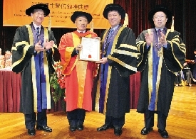 何厚鏵向李肇星頒授榮譽人文博士學(xué)位。(圖片來源:澳門日報)