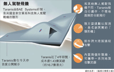 該無(wú)人駕駛飛機(jī)名為Taranis,是雷電之神的名字。Taranis由BAE Systems聯(lián)同Qinetiq、勞斯萊斯和GE Aviation花了4年時(shí)間研制,成本達(dá)1.43億英鎊,將于明年作飛行測(cè)試。