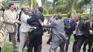 峰會(huì)第一天,利比亞總統(tǒng)衛(wèi)隊(duì)即與烏干達(dá)安全人員發(fā)生了拳腳沖突。根據(jù)CNN記者薩曼森納塔爾的描述,當(dāng)時(shí)正要舉行峰會(huì)開幕式。按照規(guī)定,只有國(guó)家首腦被允許進(jìn)入會(huì)場(chǎng)。利比亞總統(tǒng)衛(wèi)隊(duì)試圖護(hù)送卡扎菲通過入口,遂與烏干達(dá)安全人員發(fā)生爭(zhēng)論,隨后升級(jí)為肢體沖突,但是雙方?jīng)]有動(dòng)槍。