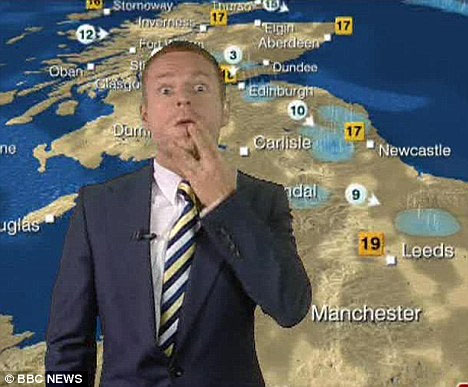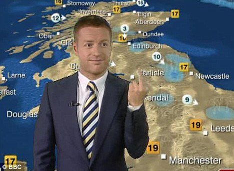 英國廣播公司天氣節(jié)目主播日前在節(jié)目中做出令人大跌眼鏡的舉動,他當(dāng)眾朝新聞主播豎中指引發(fā)熱議。