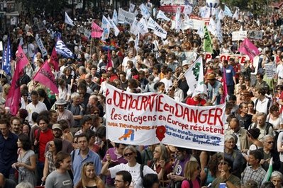 群眾揮舞旗幟、高舉橫額和抗議標語,有人打鑼打鼓,高叫口號,要求薩爾科齊收回成命,停止壓迫吉卜賽人,也要停止執(zhí)行不人道的政策。