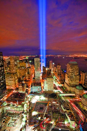 10日晚,紐約市用激光束“重現(xiàn)”世貿(mào)中心。
